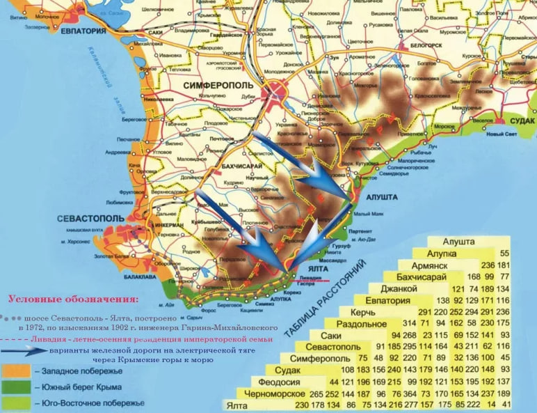 По форме Крымский полуостров напоминает гроздь винограда. С юга и запада его омывает Черное море, с востока — Азовское. Восточное побережье — скалистое, западное знаменито лечебными грязями, а самое развитое и популярное — южное. Там самые известные курортные комплексы и развлекательные центры. А еще императорские дворцы и рукотворные природные объекты: сады и парки с экзотическими растениями, скульптурами и ландшафтным дизайном, характерным скорее для средиземноморских стран.